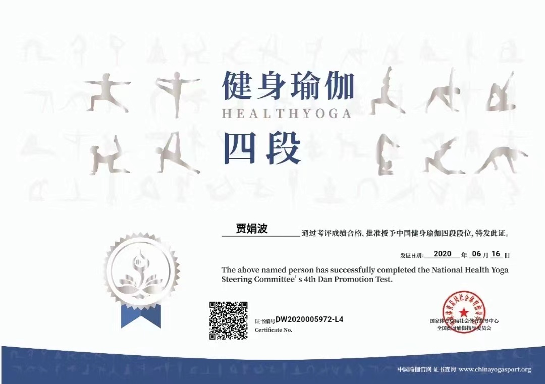 祝贺贾娟波在西安薄珈梵歌五星级场馆荣获国家体育总局健身瑜伽四段段位
