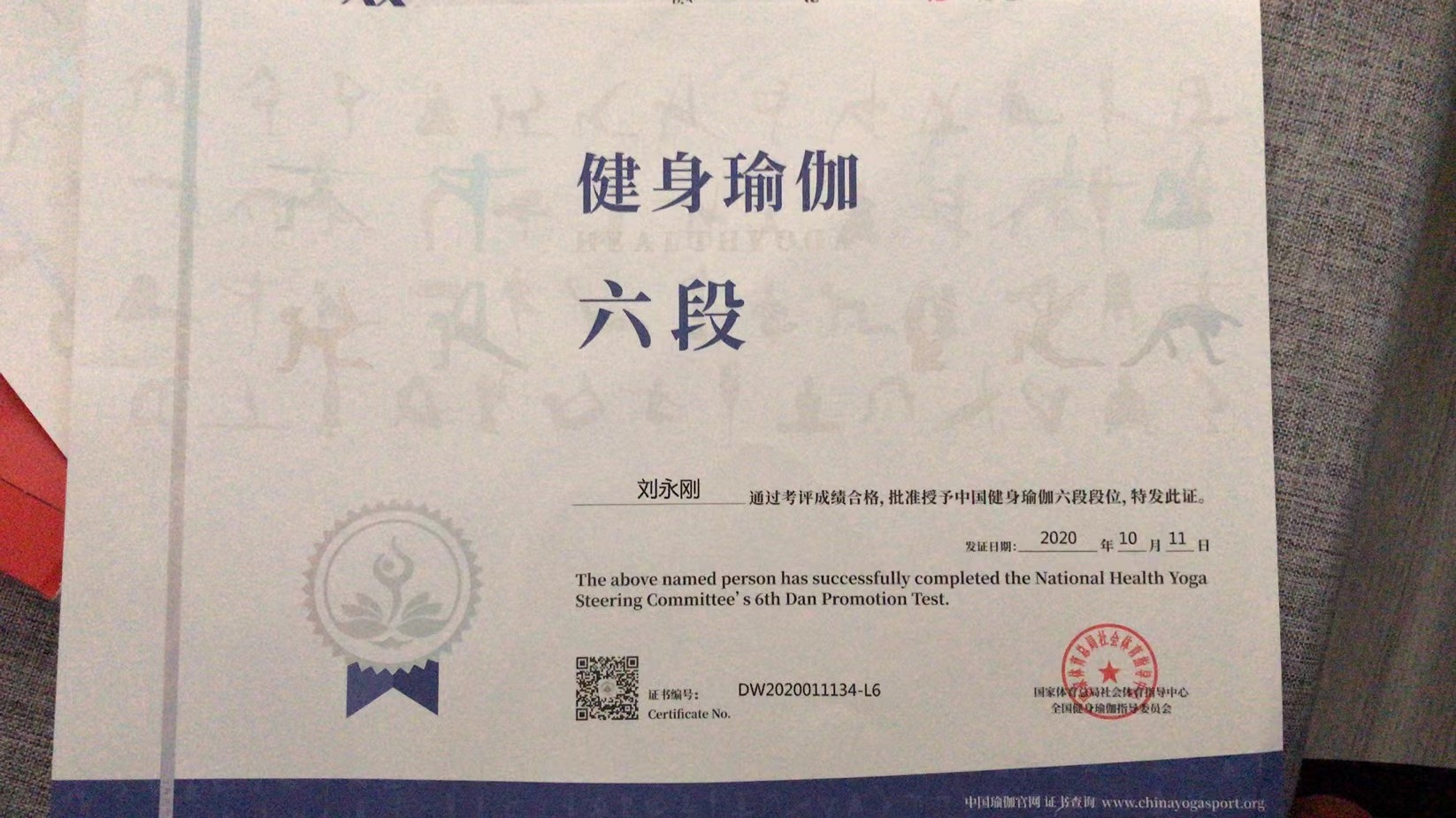 祝贺刘永刚在西安薄珈梵歌五星级场馆荣获国家体育总局健身瑜伽六段段位