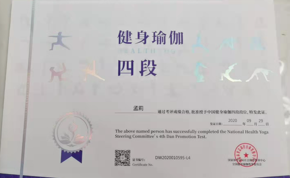 祝贺孟莉在西安薄珈梵歌五星级场馆荣获国家体育总局健身瑜伽四段段位