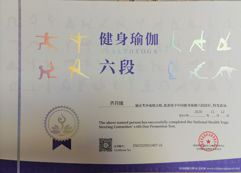 祝贺齐月娥在西安薄珈梵歌五星级场馆荣获国家体育总局健身瑜伽六段段位