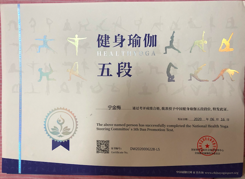 祝贺宁金梅在西安薄珈梵歌五星级场馆荣获国家体育总局健身瑜伽五段段位