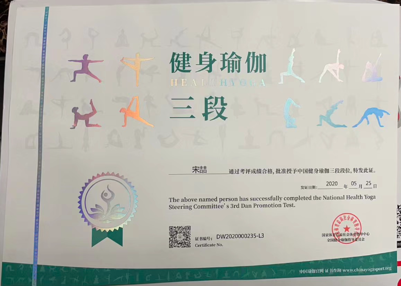祝贺宋喆在西安薄珈梵歌五星级场馆荣获国家体育总局健身瑜伽三段段位