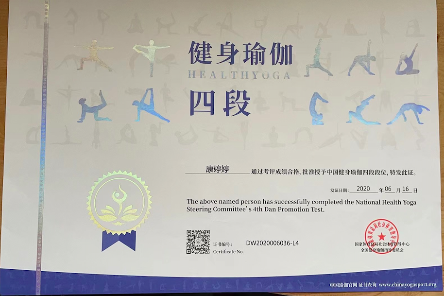 祝贺康婷婷在西安薄珈梵歌五星级场馆荣获国家体育总局健身瑜伽四段段位