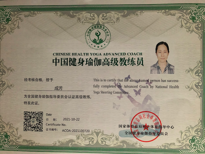 祝贺成芳在西安薄珈梵歌五星级场馆荣获国家体育总局健身瑜伽高级教练员