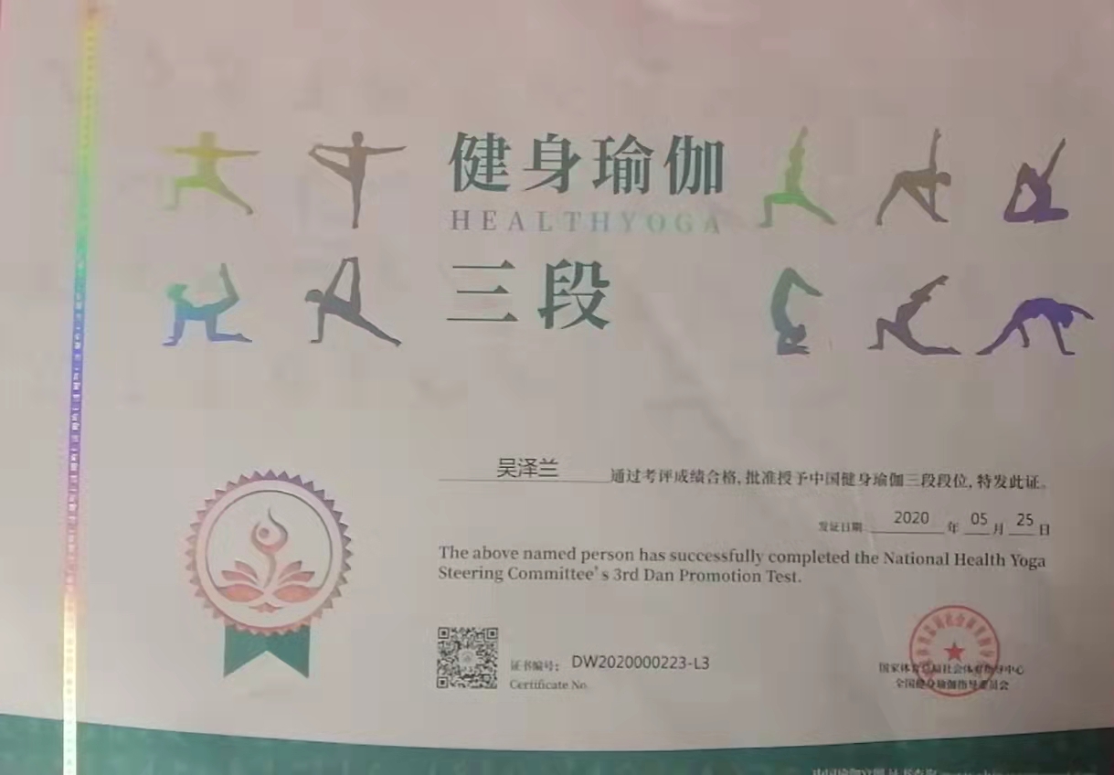 祝贺吴泽兰在西安薄珈梵歌五星级场馆荣获国家体育总局健身瑜伽三段段位