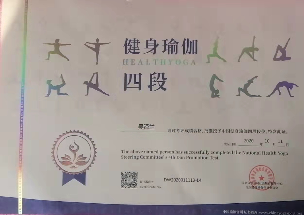 祝贺吴泽兰在西安薄珈梵歌五星级场馆荣获国家体育总局健身瑜伽四段段位