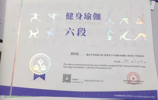 祝贺栗彩丽在西安薄珈梵歌五星级场馆荣获国家体育总局健身瑜伽六段段位