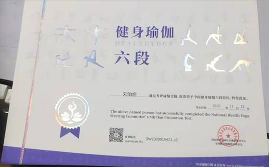 祝贺刘治俞在西安薄珈梵歌五星级场馆荣获国家体育总局健身瑜伽六段段位