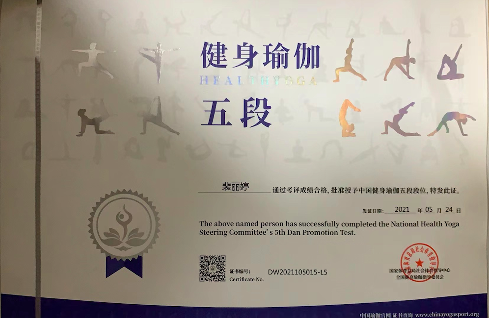 祝贺裴丽婷在西安薄珈梵歌五星级场馆荣获国家体育总局健身瑜伽五段段位