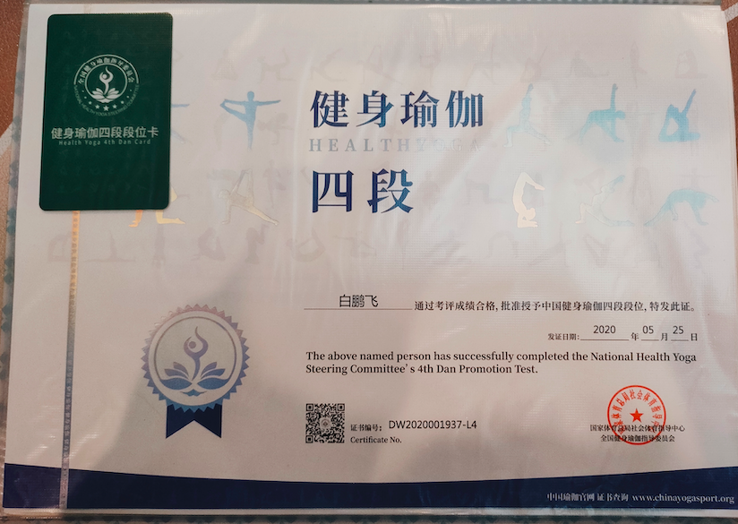 祝贺白鹏飞在西安薄珈梵歌五星级场馆荣获国家体育总局健身瑜伽四段段位