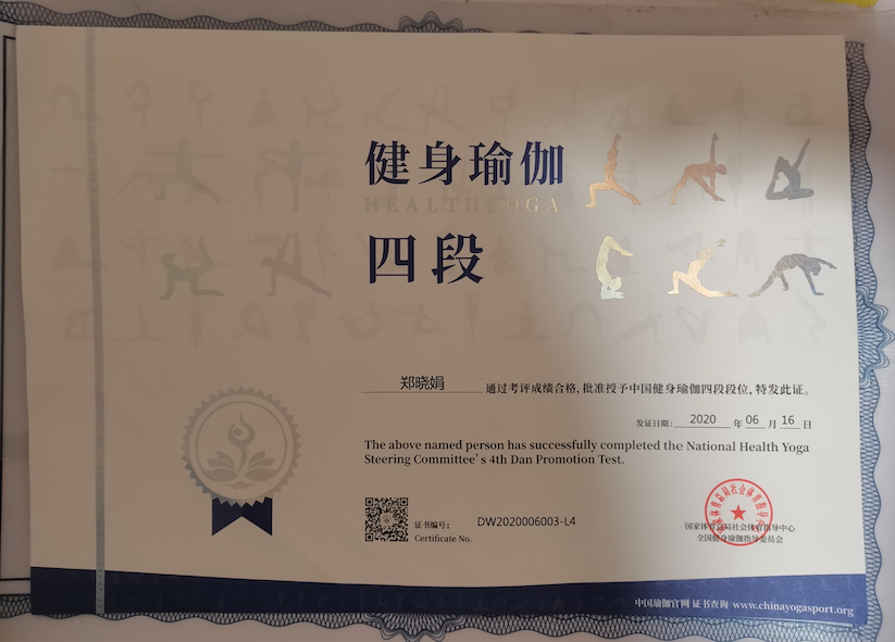 祝贺郑晓娟在西安薄珈梵歌五星级场馆荣获国家体育总局健身瑜伽四段段位