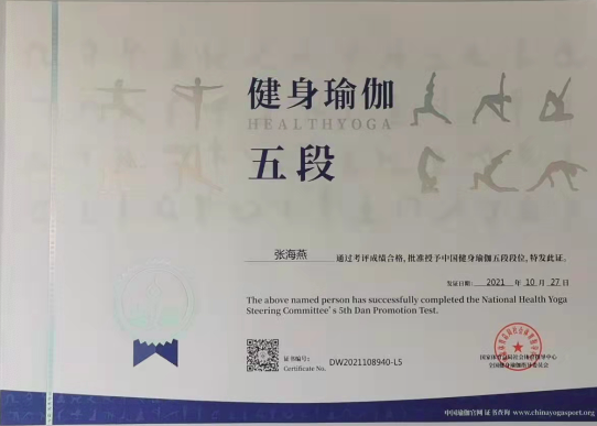祝贺张海燕在西安薄珈梵歌五星级场馆荣获国家体育总局健身瑜伽五段段位