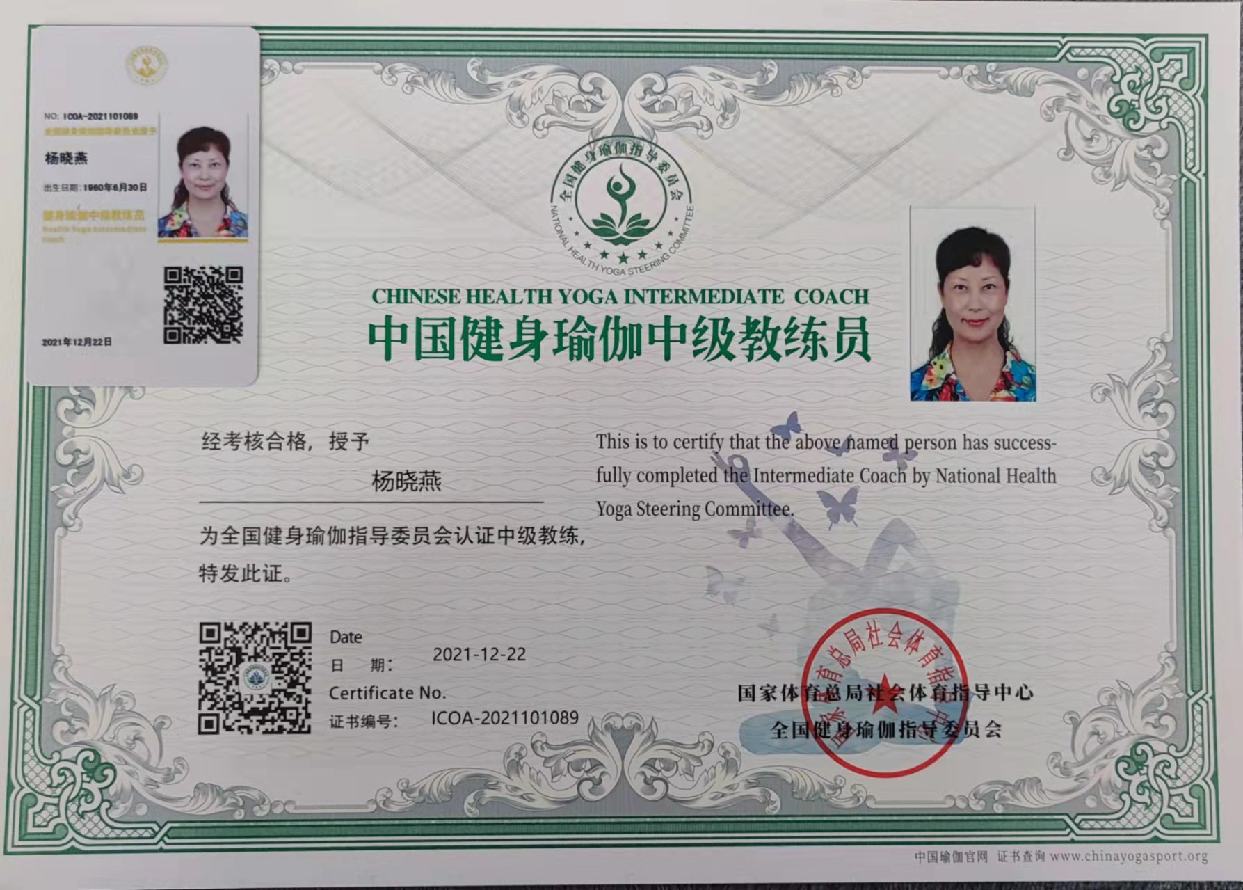 祝贺杨晓燕在西安薄珈梵歌五星级场馆荣获国家体育总局健身瑜伽中级教练员