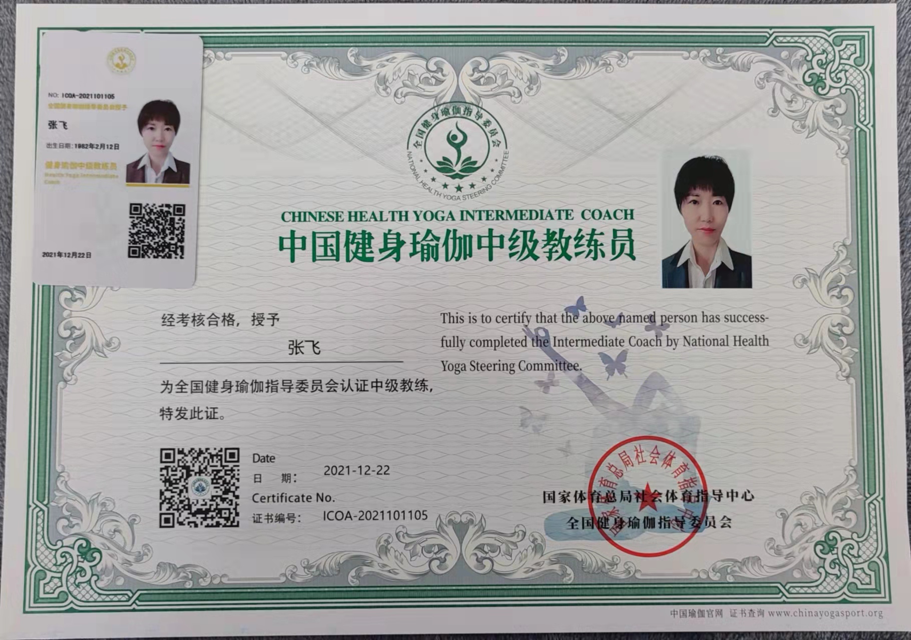 祝贺张飞在西安薄珈梵歌五星级场馆荣获国家体育总局健身瑜伽中级教练员