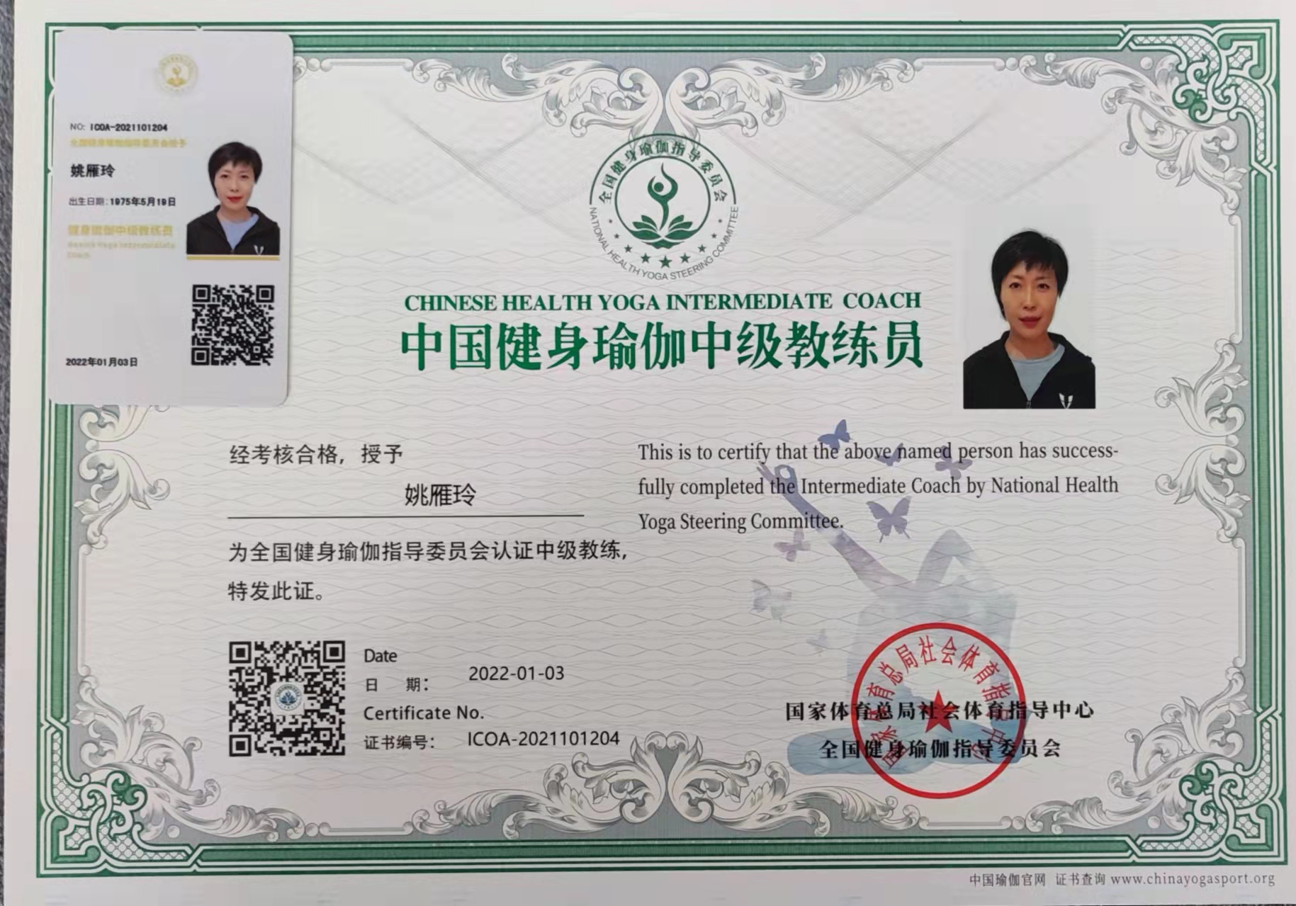 姚雁玲中国健身瑜伽中级教练员