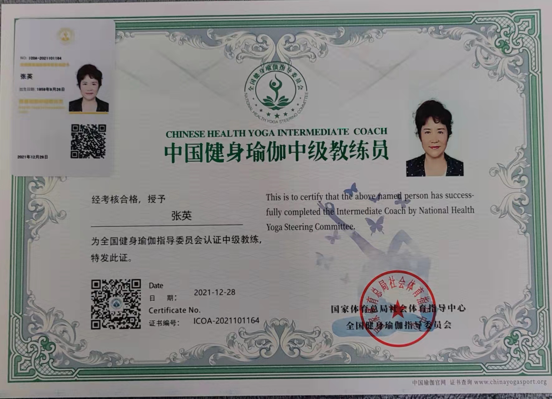 祝贺张英在西安薄珈梵歌五星级场馆荣获国家体育总局健身瑜伽中级教练员