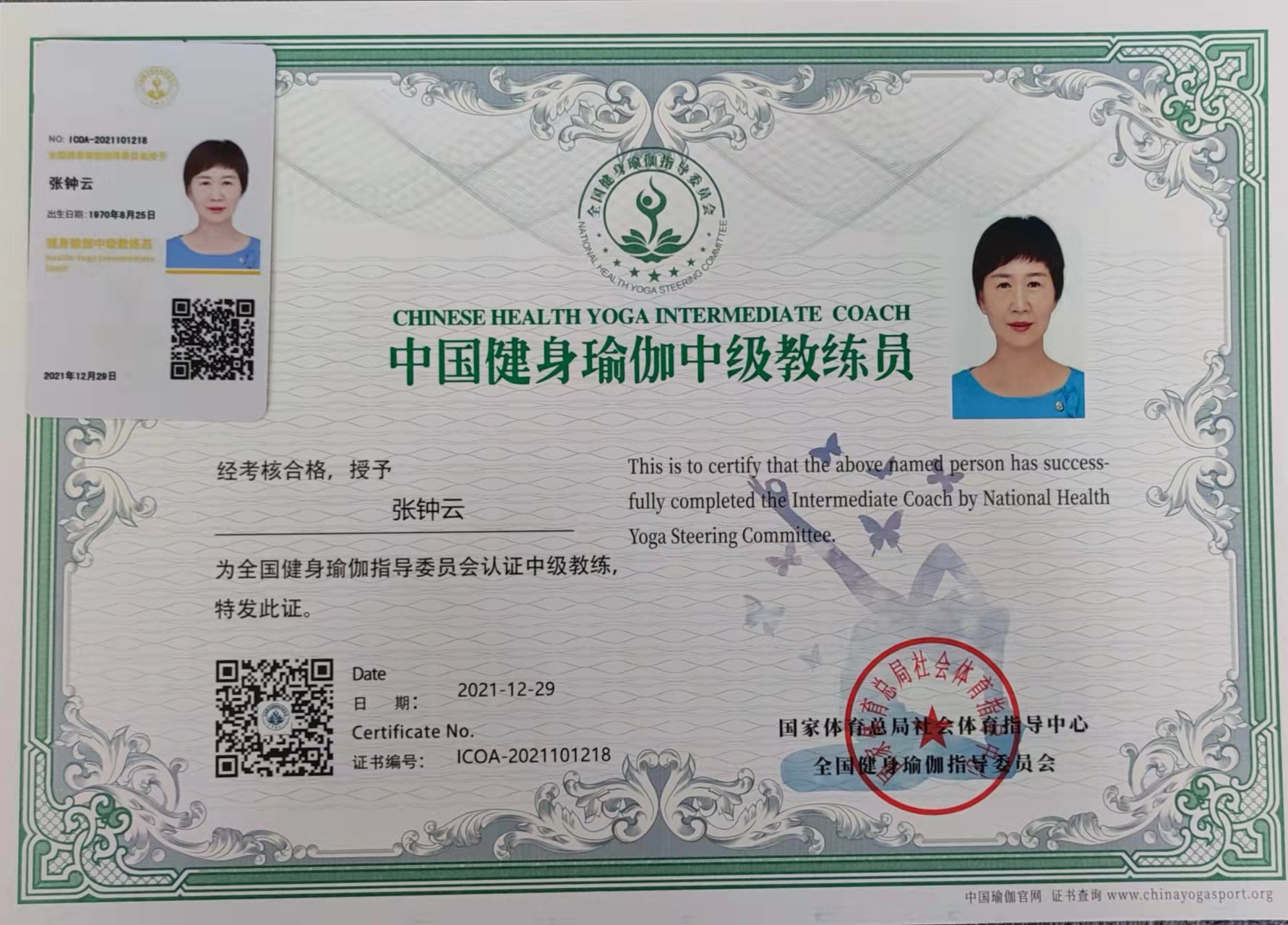 祝贺张钟云在西安薄珈梵歌五星级场馆荣获国家体育总局健身瑜伽中级教练员