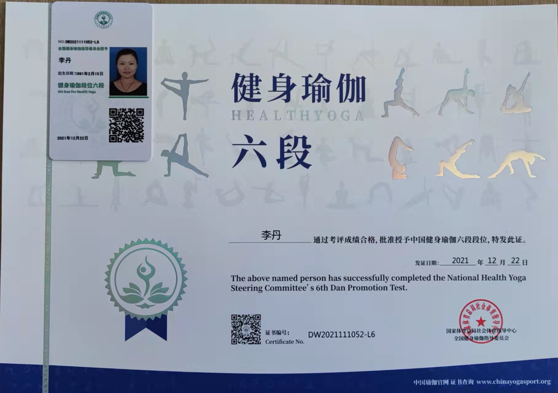 祝贺李丹在西安薄珈梵歌五星级场馆荣获国家体育总局健身瑜伽六段段位