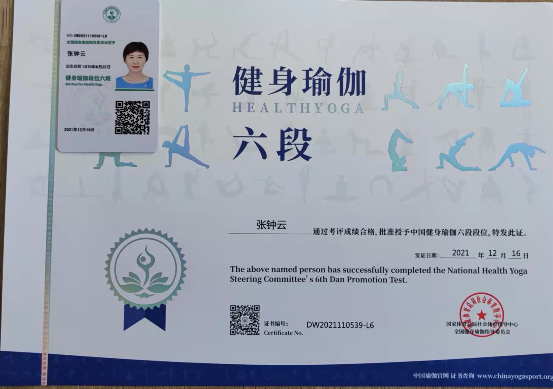 祝贺张钟云在西安薄珈梵歌五星级场馆荣获国家体育总局健身瑜伽六段段位