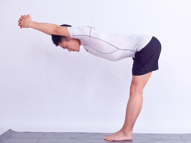 (2)两手体前十指交握并上举过头,上臂贴耳侧;髋屈曲,躯干、手臂与地面平行;目视下方。