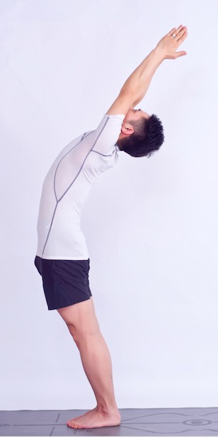2、双臂从身体两侧向上伸展举至头顶,掌心向前,胸骨上提,打开胸腔,以手臂带动躯干向后上方伸展;目视上方。