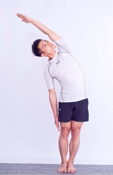 2.左臂经体侧向上伸展,掌心向内;身体向右侧弯;转头,目视上方。