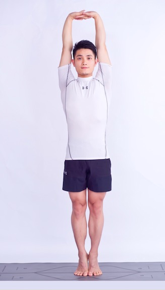 2.双脚分开与髋同宽,双手体前十指交叉,翻掌向上举至头顶,伸直双臂,同时提踵,目视前方。