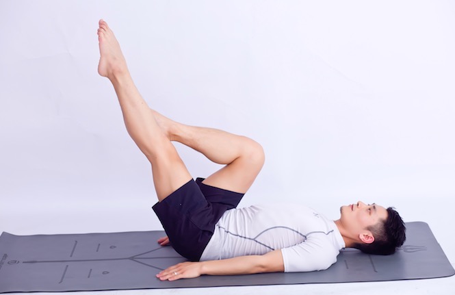 2.双腿上抬垂直于地面,依次交替屈膝、伸直,向前、向后做动态蹬车运动;几组之后,双腿并拢同步屈膝、伸直,向前、向后做动态蹬车运动 。