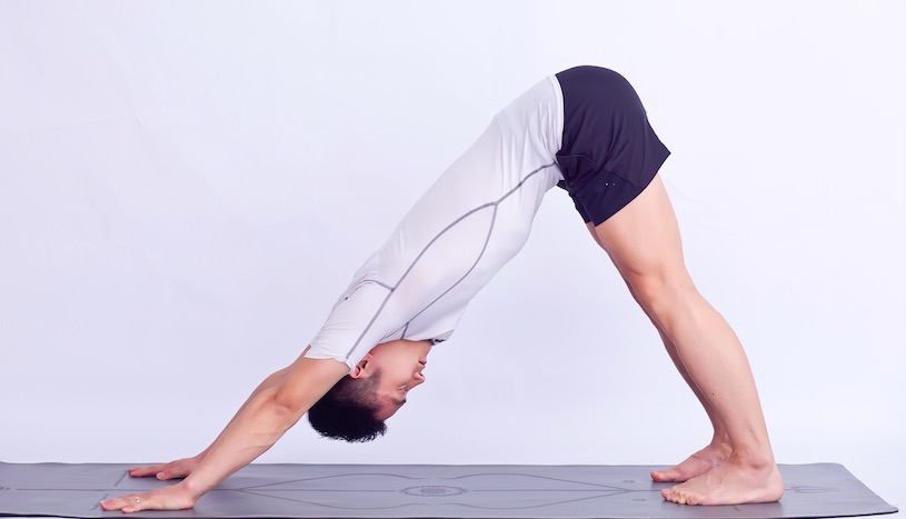 2.身体前倾,两手置于肩下方,两臂、大腿垂直地面,两脚分开,与坐骨同宽;脚尖回勾落地,伸直双膝,臀部上提,足跟下压。
