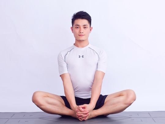 2.屈双膝、脚掌相合,脚跟靠近会阴,+指交叉抓握脚背,躯干直立。两膝上提、下沉,反复练习;目视前方。