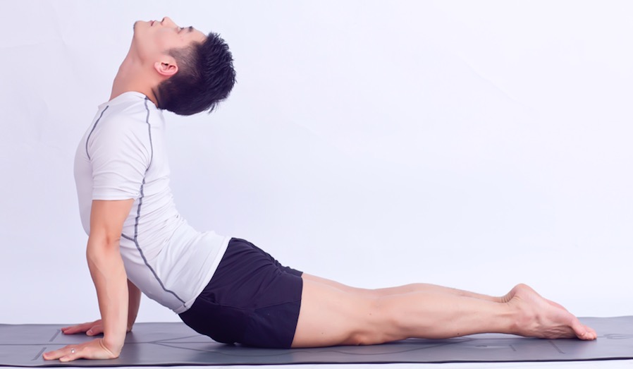 要点:推起前,手指尖与肩平齐在一线;推起后,胸腔打开,胸椎充分上提、后展,耻骨贴地,头不可过度后仰。