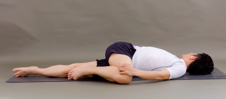 要点:双肩不离开地面,屈膝腿内侧贴地,头转向相反方向。