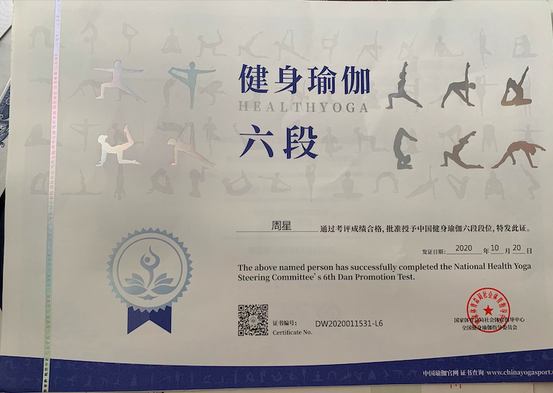 祝贺周星在西安薄珈梵歌五星级场馆荣获国家体育总局健身瑜伽六段段位