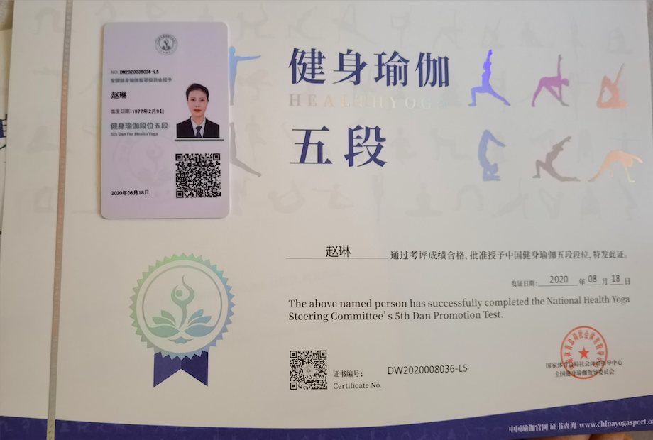 祝贺赵琳在西安薄珈梵歌五星级场馆荣获国家体育总局健身瑜伽五段段位