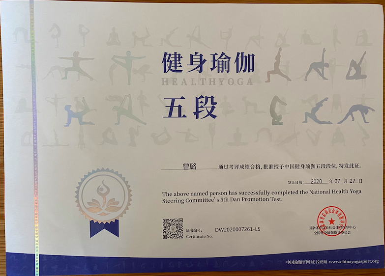祝贺曾璐在西安薄珈梵歌五星级场馆荣获国家体育总局健身瑜伽五段段位