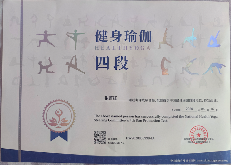 祝贺张菁钰在西安薄珈梵歌五星级场馆荣获国家体育总局健身瑜伽四段段位