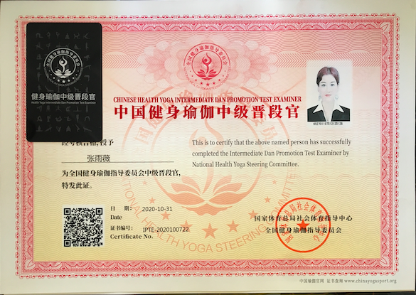 张雨薇中国健身瑜伽中级晋段官
