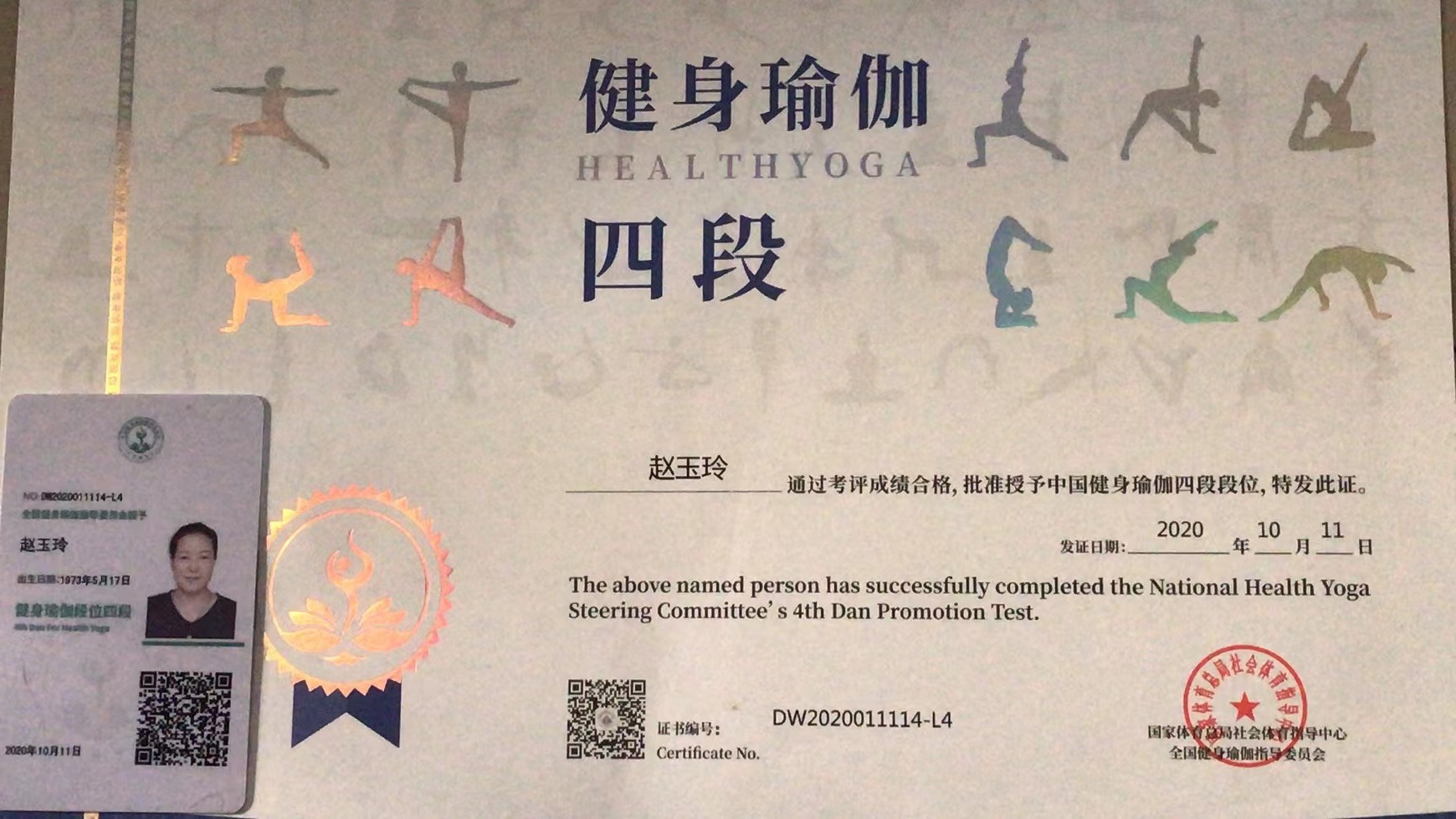 祝贺赵玉玲在西安薄珈梵歌五星级场馆荣获国家体育总局健身瑜伽四段段位
