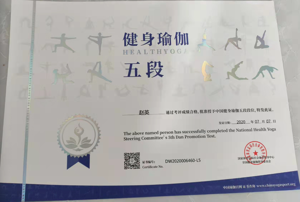 祝贺赵英在西安薄珈梵歌五星级场馆荣获国家体育总局健身瑜伽五段段位