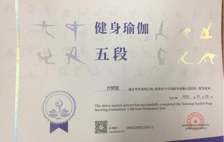祝贺方梦圆在西安薄珈梵歌五星级场馆荣获国家体育总局健身瑜伽五段段位