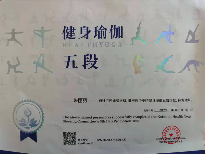 祝贺朱丽丽在西安薄珈梵歌五星级场馆荣获国家体育总局健身瑜伽五段段位