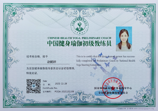 赵懿婷中国健身瑜伽初级教练员
