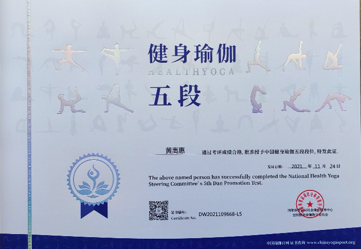 祝贺黄离惠在西安薄珈梵歌五星级场馆荣获国家体育总局健身瑜伽五段段位