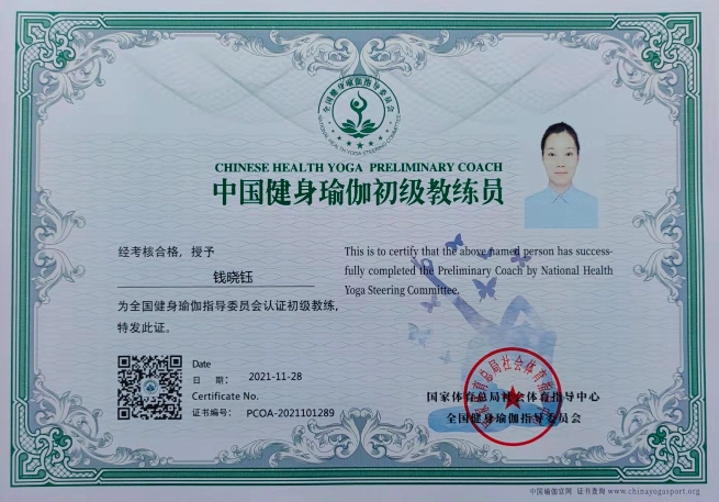 钱晓钰中国健身瑜伽初级教练员