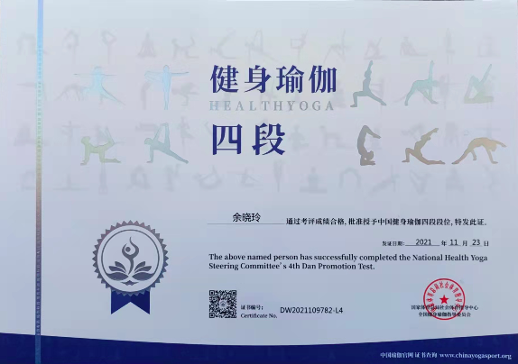 祝贺余晓玲在西安薄珈梵歌五星级场馆荣获国家体育总局健身瑜伽四段段位