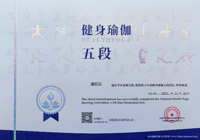 祝贺唐后云在西安薄珈梵歌五星级场馆荣获国家体育总局健身瑜伽五段段位