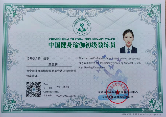 贾慧润中国健身瑜伽初级教练员