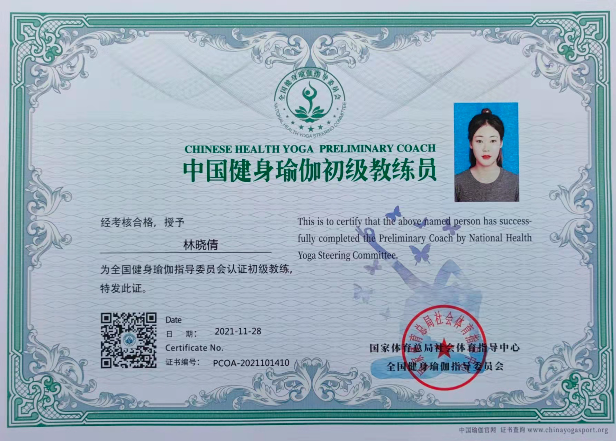 祝贺林晓倩在西安薄珈梵歌五星级场馆荣获国家体育总局健身瑜伽初级教练员