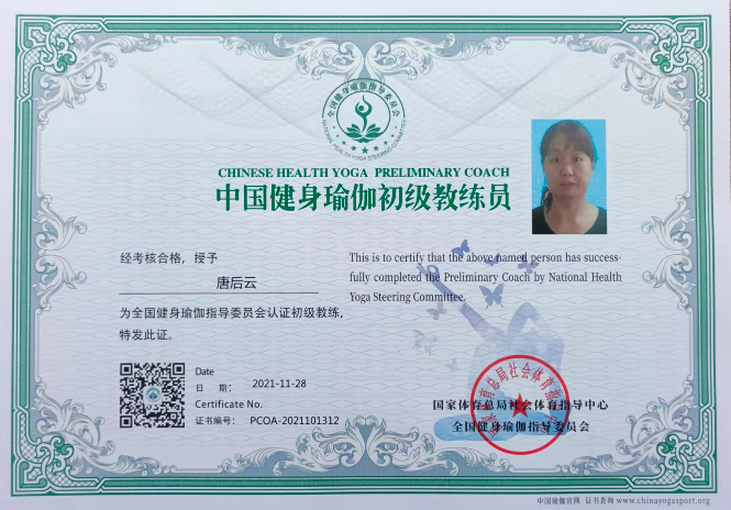 祝贺唐后云在西安薄珈梵歌五星级场馆荣获国家体育总局健身瑜伽初级教练员