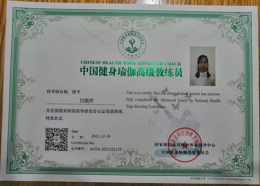 祝贺吕晓芳在西安薄珈梵歌五星级场馆荣获国家体育总局健身瑜伽高级教练员